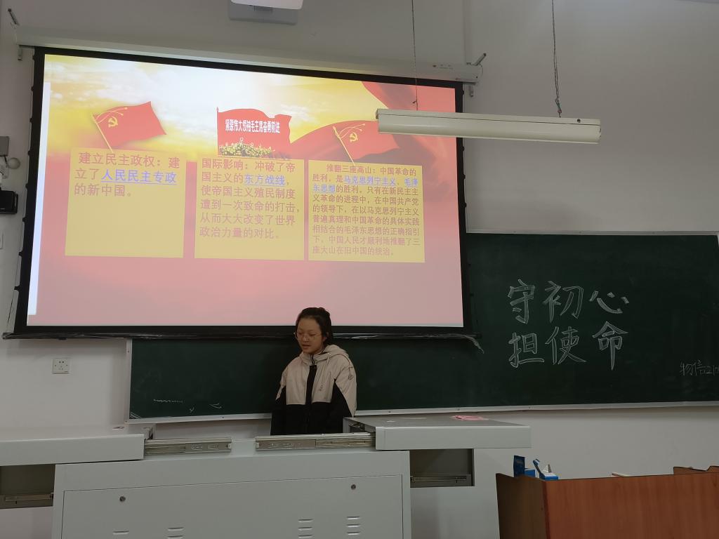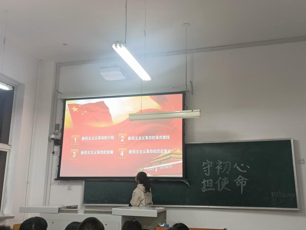 活动中,支部成员岳琳坤结合PPT向同学们详细讲述了新民主主义革命时期的发展历史以及辉煌成就,使同学们认识和了解了新民主主义革命时期,中国共产党带领中国人民找到了一条具有中国特色的革命道路的艰辛历程。在问答环节,同学们积极踊跃回答问题,检验学习效果,大家纷纷表示会珍惜现在的幸福生活,奋发图强,为建设美好中国贡献自己的青春力量。(文/2104班 高雅婷 摄/2104班 高雅婷)