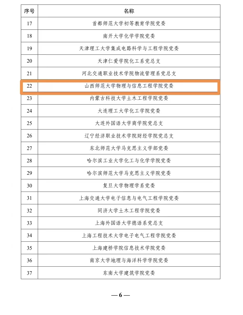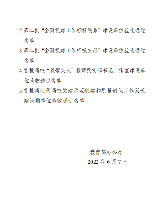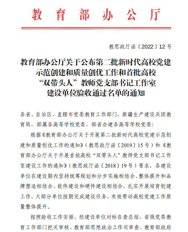 2022年6月7日,教育部办公厅公布了《第二批新时代高校党建示范创建和质量创优工作和首批高校“双带头人”教师党支部书记工作室建设单位验收通过名单的通知》(教思政厅函〔2022〕12 号),我校物信学院党委作为第二批全国党建工作标杆院系培育创建单位,经对标自查总结、省级党委教育工作部门把关审核、教育部思想政治工作司审查、教育部政府门户网站公示,顺利通过验收。