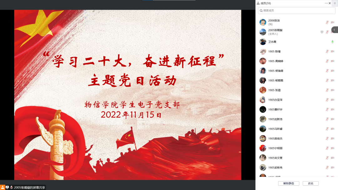 11月15日,我院学生电子党支部通过腾讯会议线上开展了“学习二十大,奋进新征程”主题党日活动。本次活动由张璐璇同志主持,支部全体党员参加了活动。