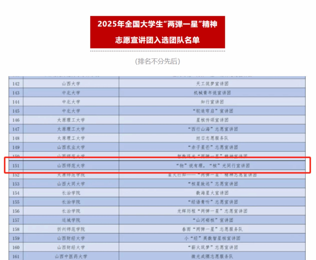 近日,我院在全国专项队伍申报中成绩斐然,两支队伍成功入选,展现出我院学子的卓越风采与担当。其中“物”说有理,“核”光同行宣讲团入选2025年全国大学生“两弹一星”精神志愿宣讲团,236普语飞扬实践队入选“推普助力乡村振兴”全国大学生暑期社会实践志愿服务参与协同团队!