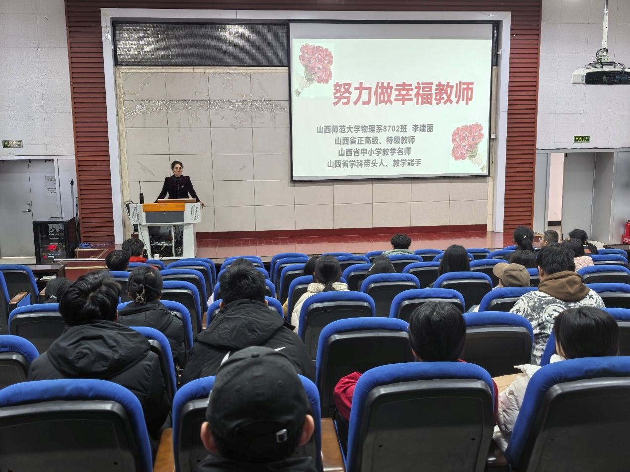 11月16日上午,学院邀请我院优秀校友、汾阳中学正高级教师李建丽老师作题为《努力做幸福教师》的讲座。本次讲座由副院长李俊生主持,学院物理学专业本科生聆听了讲座。