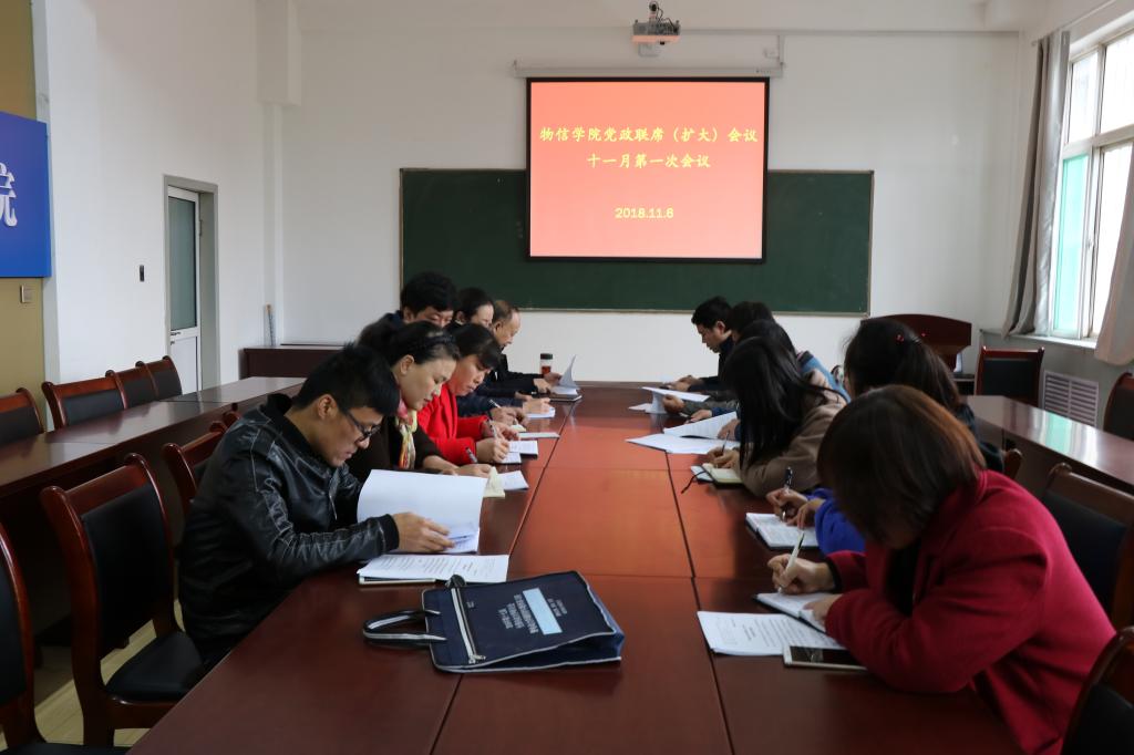 2018年11月6日上午11:00,我院在四号楼二层多功能会议室召开十一月份第一次党政联席(扩大)会议。全体院领导出席会议,全体中层干部和专职辅导员参加了会议。会议由院党委书记陈向波主持。