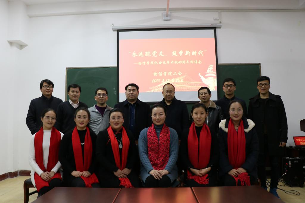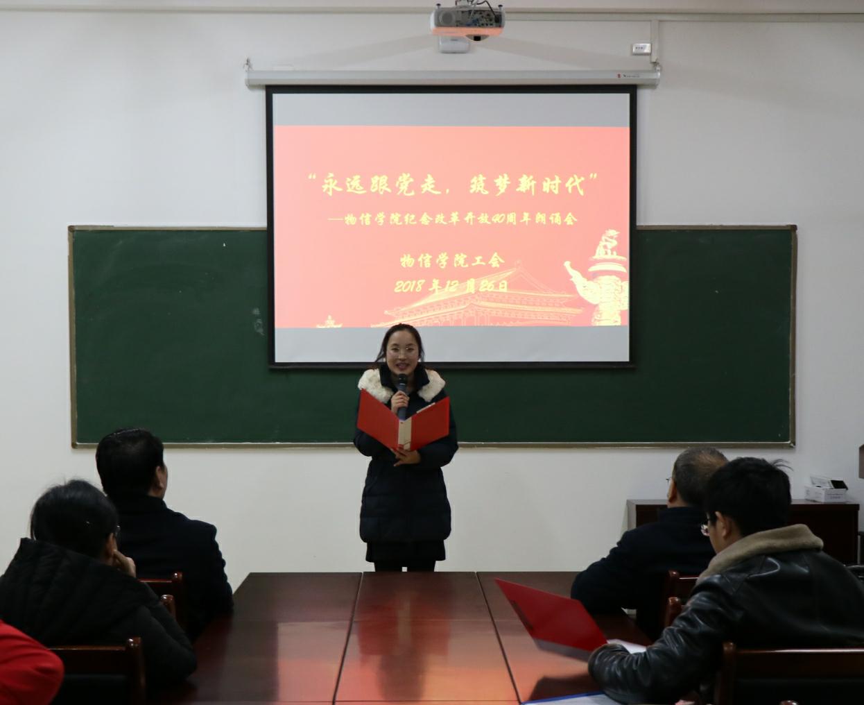 2018年12月26日晚上7:00,我院工会在四号楼二层多功能会议室举办“永远跟党走,筑梦新时代——物信学院庆祝改革开放40周年朗诵会。”院党委书记陈向波、院长张进军出席朗诵会现场,学院教职工参加了朗诵。朗诵会由马丽娜老师主持。