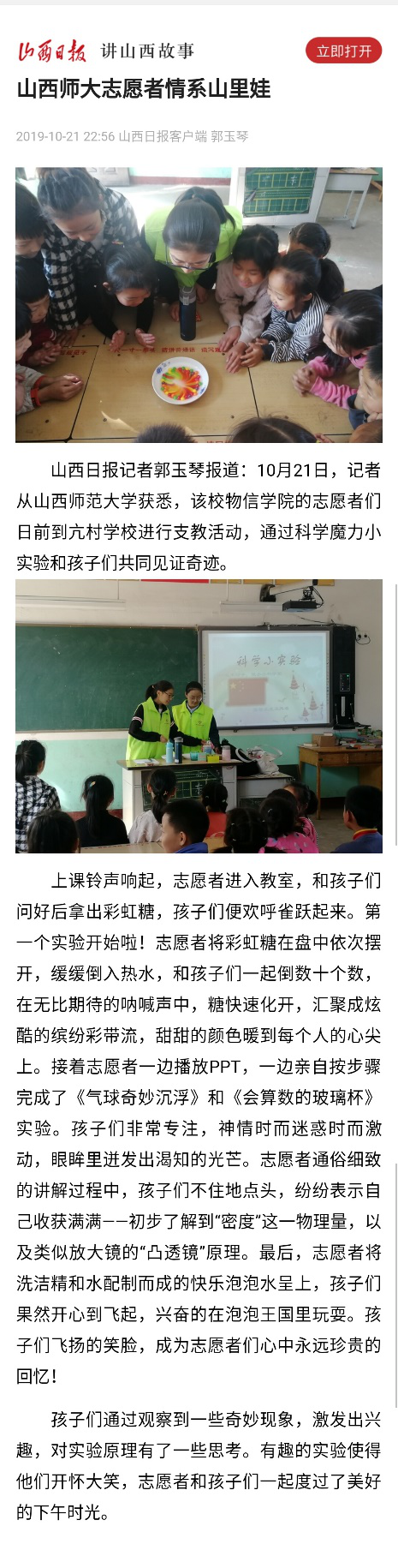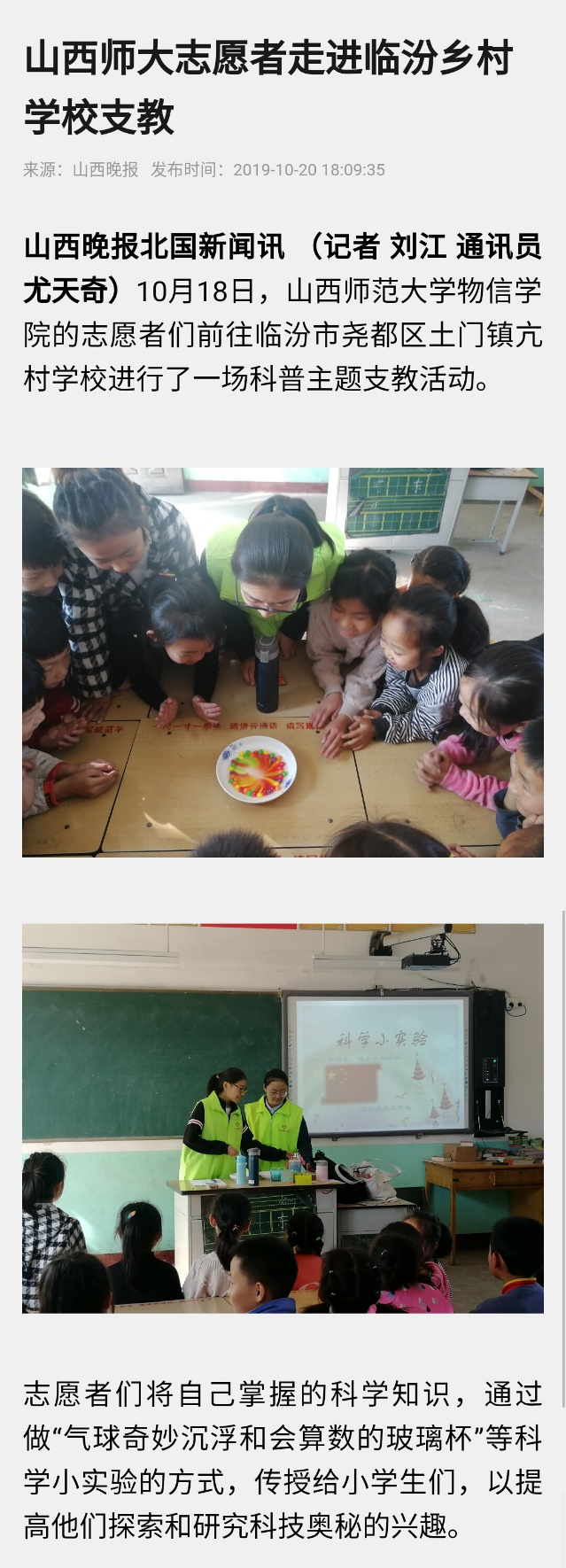 2019年10月20日、21日,山西日报客户端和山西晚报分别以“山西师大志愿者情系山里娃”和“山西师大志愿者走进临汾乡村学校支教”为题,对我院的志愿者们前往临汾市尧都区亢村学校进行的一场科普主题支教活动进行了报道。