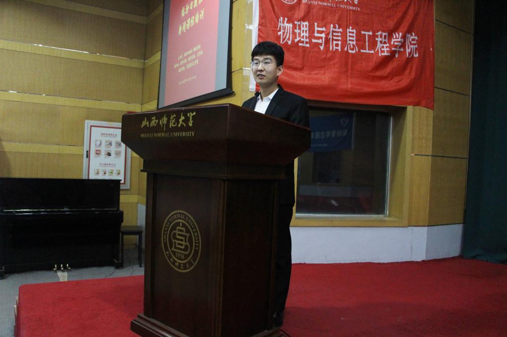 我院团委学生会赵欣宇致辞。他代表物信学院团委学生会对临汾日报领导老师们的到来表示热烈的欢迎。同时他希望同学们能在此次培训中学习到知识、学以致用。