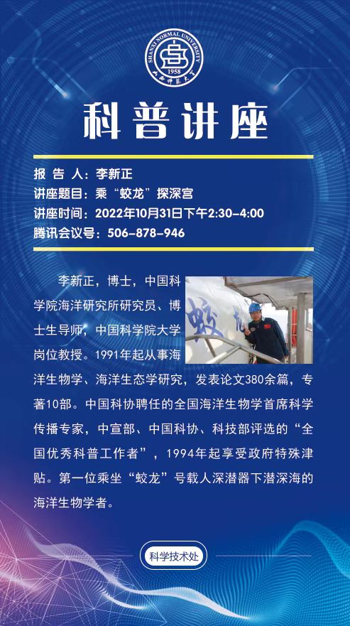 【预告】中国科学院海洋研究所李新正研究员应我校邀请作线上科普讲座