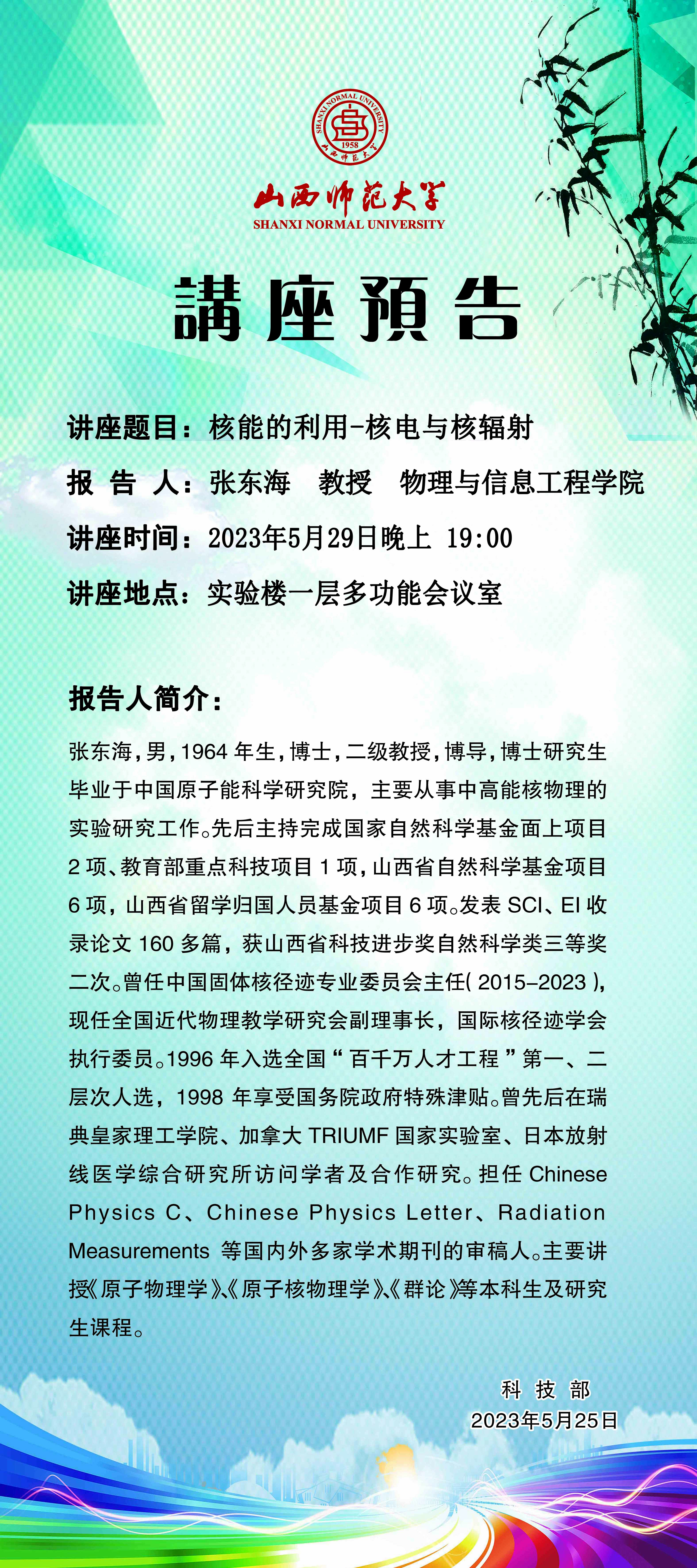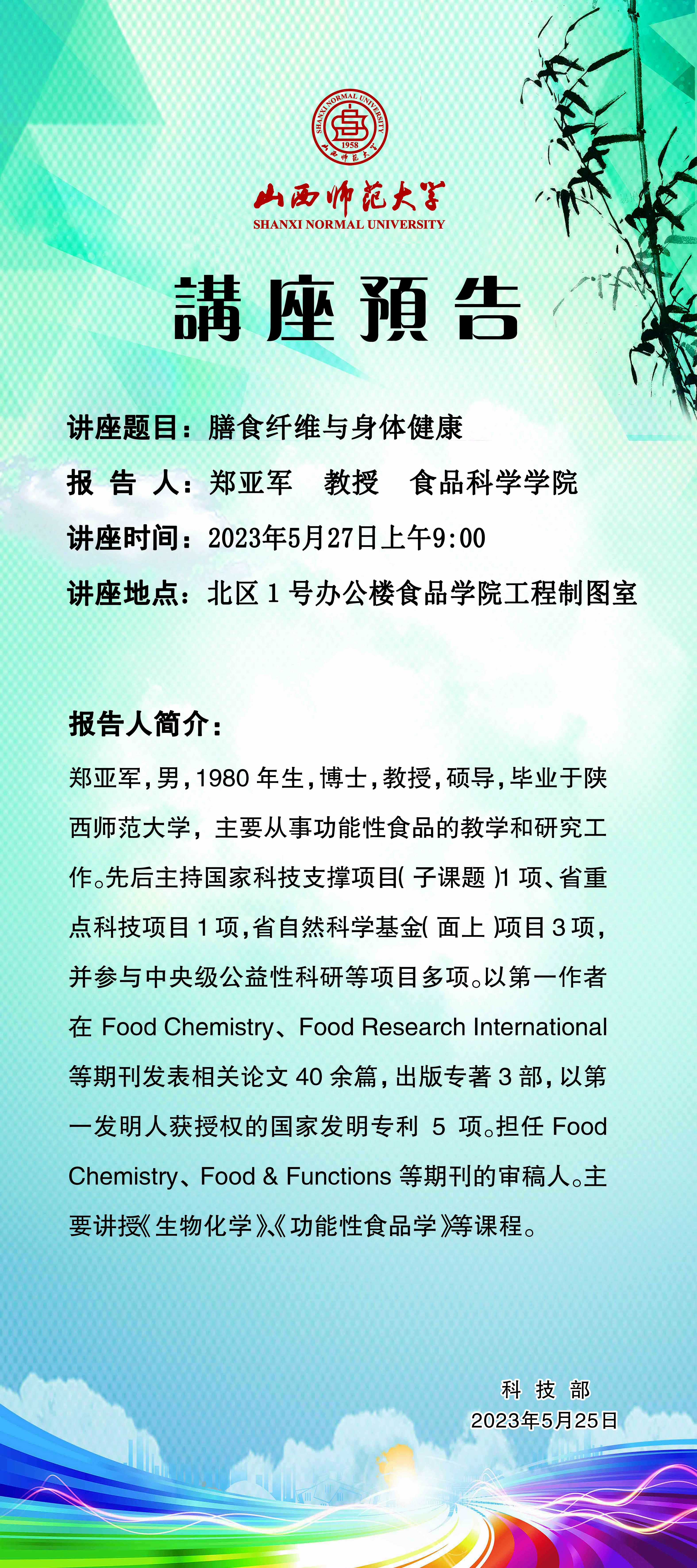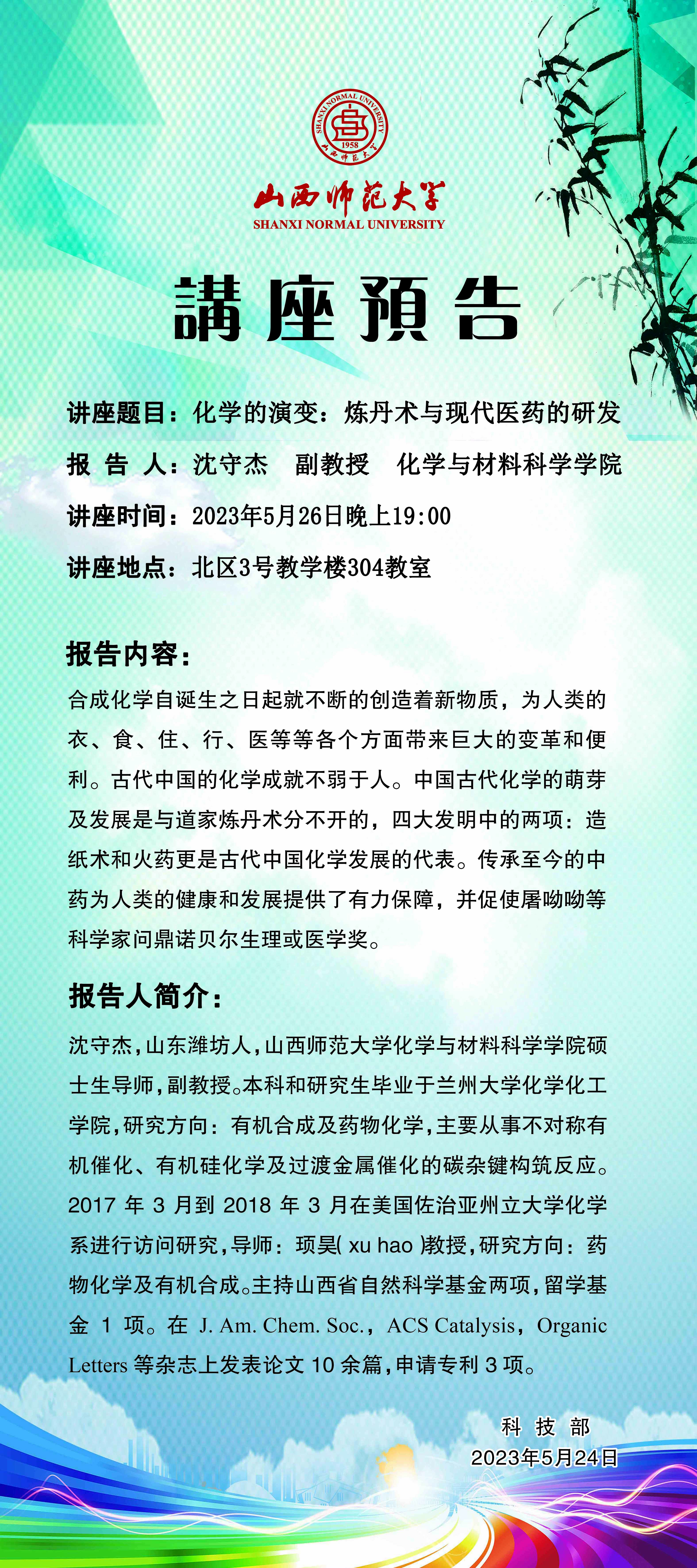 为加快推进科技政策扎实落地,进一步普及科学知识,我校在2023年山西省科技活动周(5月20-31日)期间举办“我是师大科技人,科技创新在行动”系列科普讲座。以下为活动期间讲座预告(按时间顺序排列),欢迎各学院师生踊跃参加讲座!