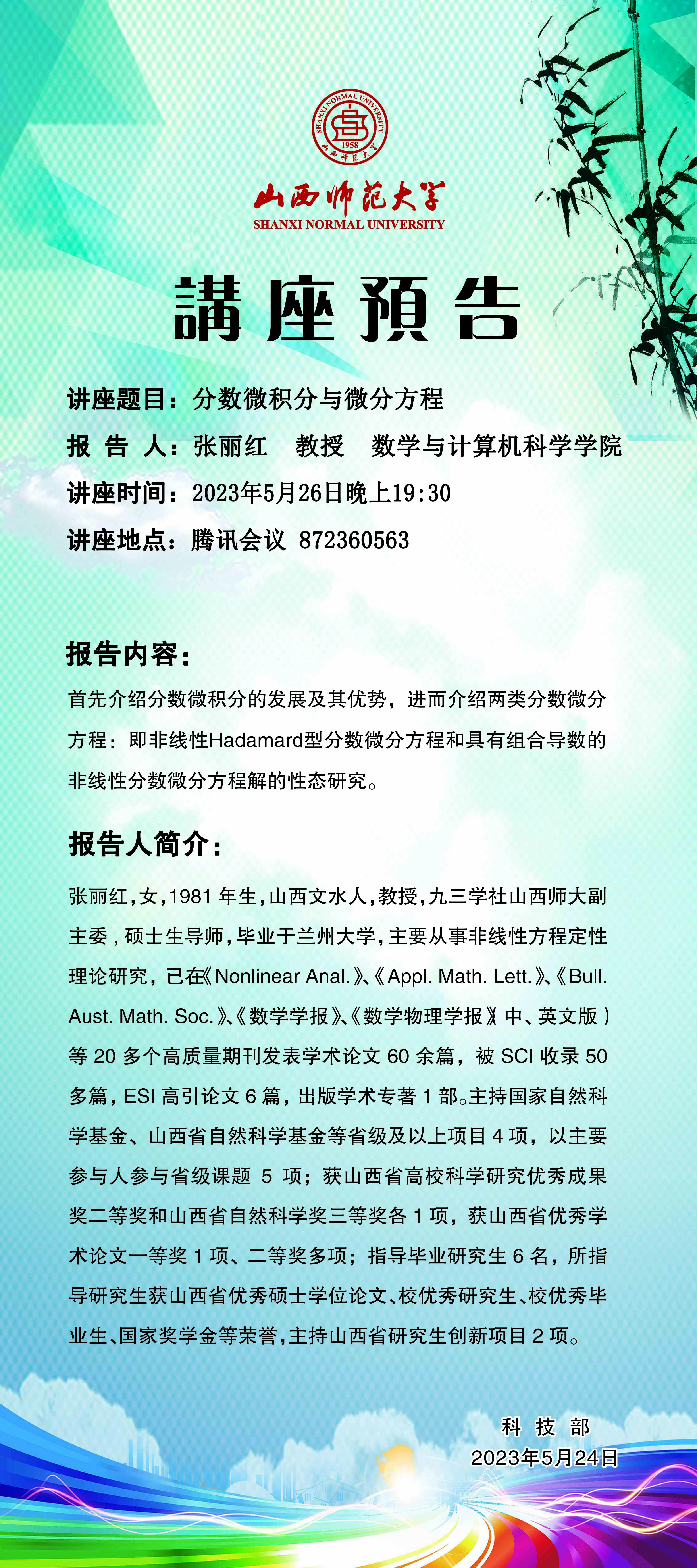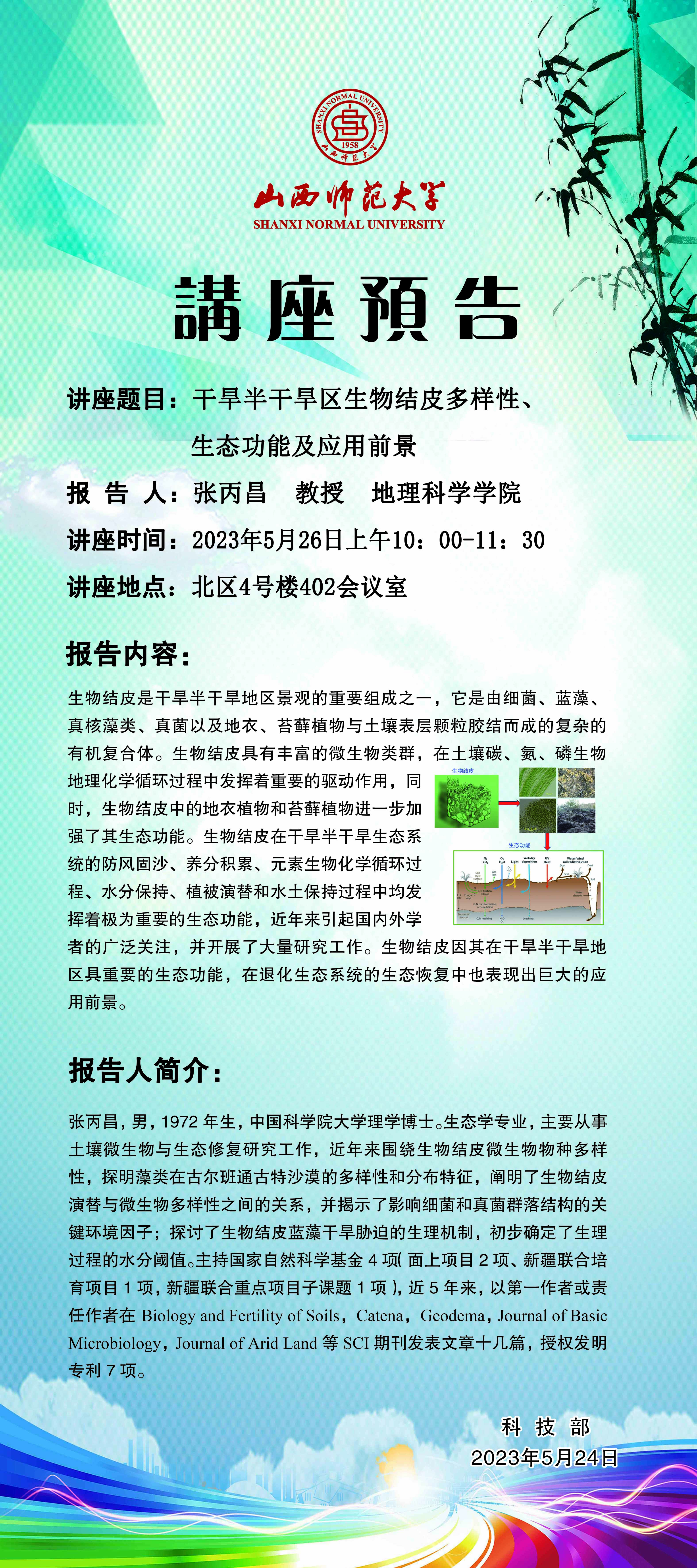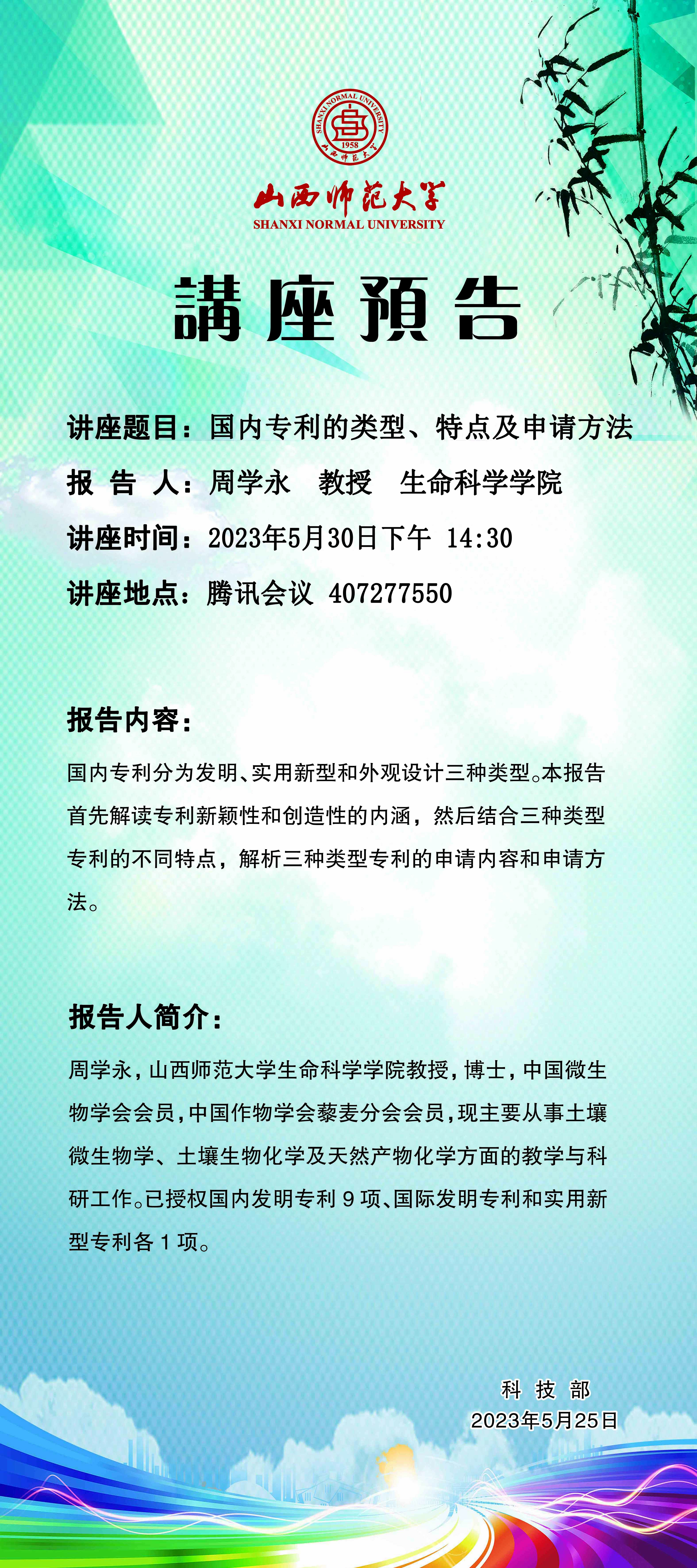 为加快推进科技政策扎实落地,进一步普及科学知识,我校在2023年山西省科技活动周(5月20-31日)期间举办“我是师大科技人,科技创新在行动”系列科普讲座。以下为活动期间讲座预告(按时间顺序排列),欢迎各学院师生踊跃参加讲座!