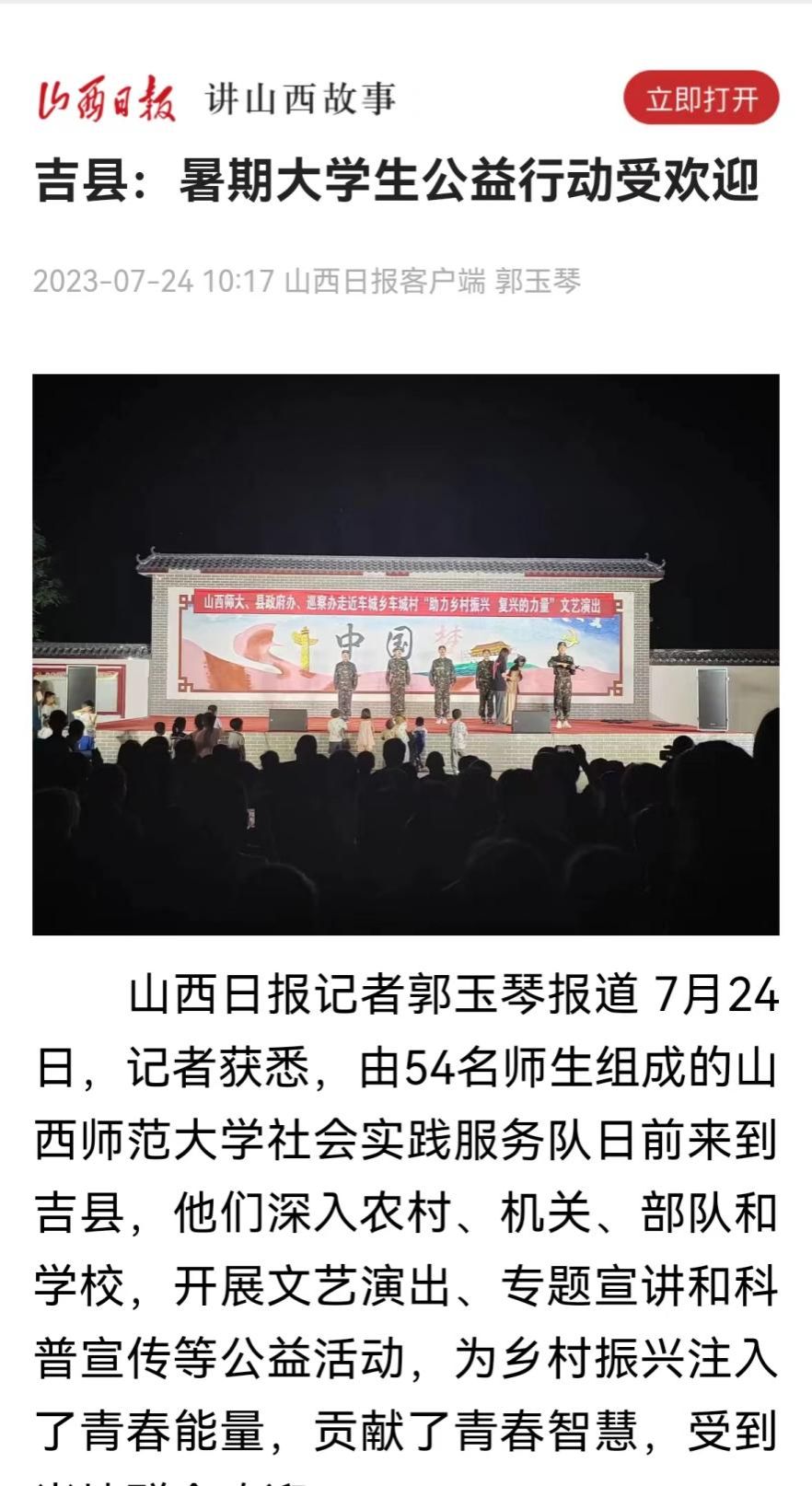 2023年7月24日,《山西日报》客户端以“吉县:暑期大学生公益行动受欢迎”报道了我院科普活动。