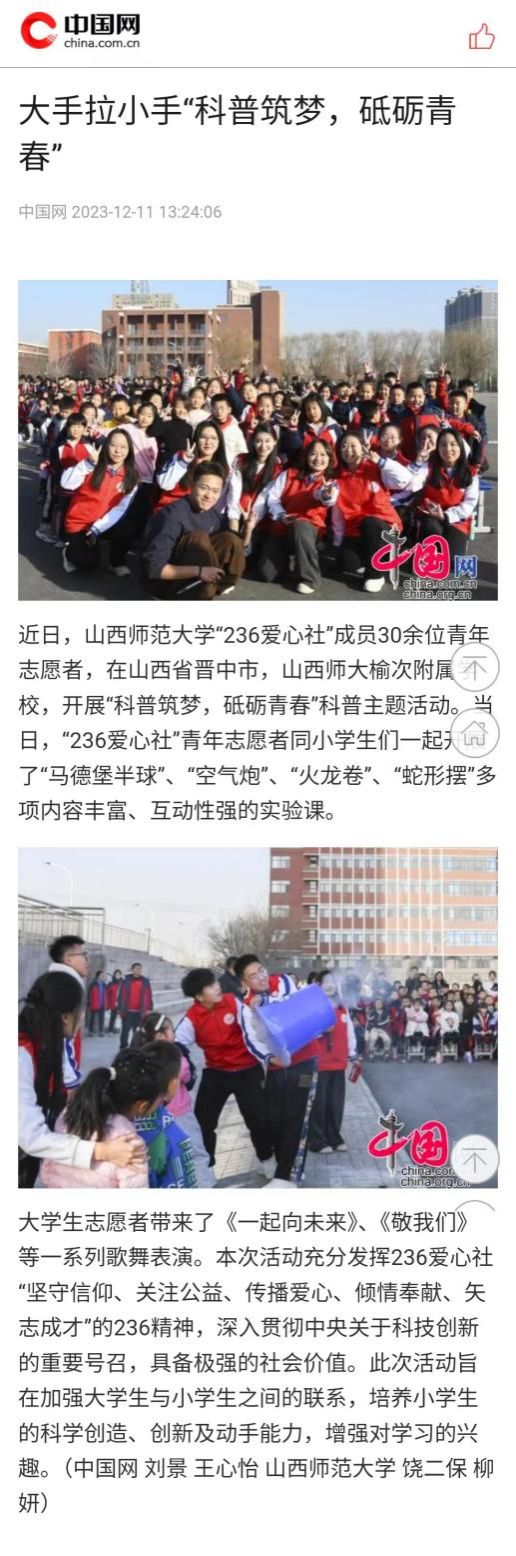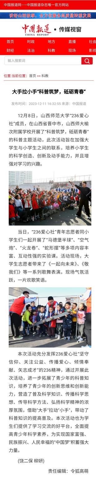 2023年12月11日,《中国网》、《中国报道网》以“大手拉小手'科普筑梦,砥砺青春'”为题,报道了我院科普宣讲队“科普筑梦,砥砺青春”科普主题活动。