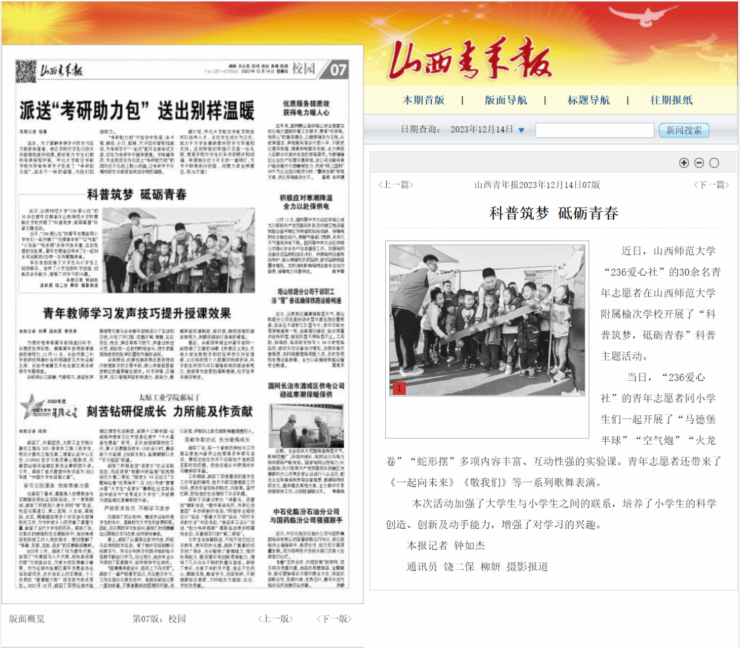 2023年12月14日,《山西青年报》以“科普筑梦,砥砺青春”为题,报道了我院科普宣讲队“科普筑梦,砥砺青春”科普主题活动。